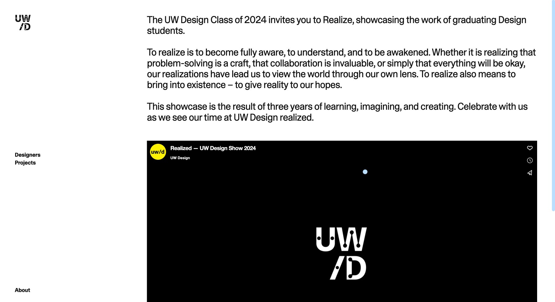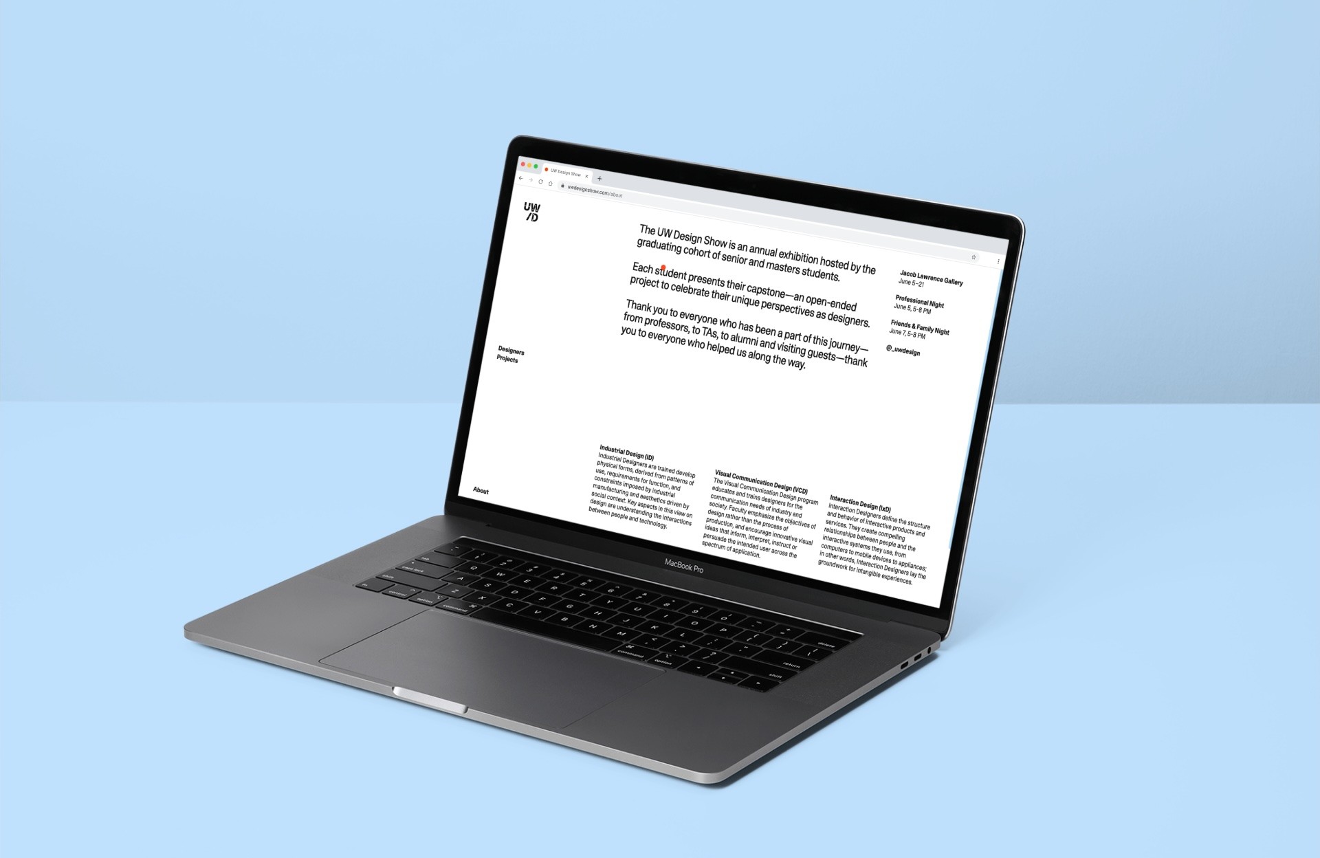 The UW Design Show is an annual exhibition showcasing capstone projects from graduating undergraduate and master’s design students, celebrating each designer’s unique perspective and approach. Alongside the in-person exhibition, the UW Design Show website preserves these projects and their creators as a lasting archive.